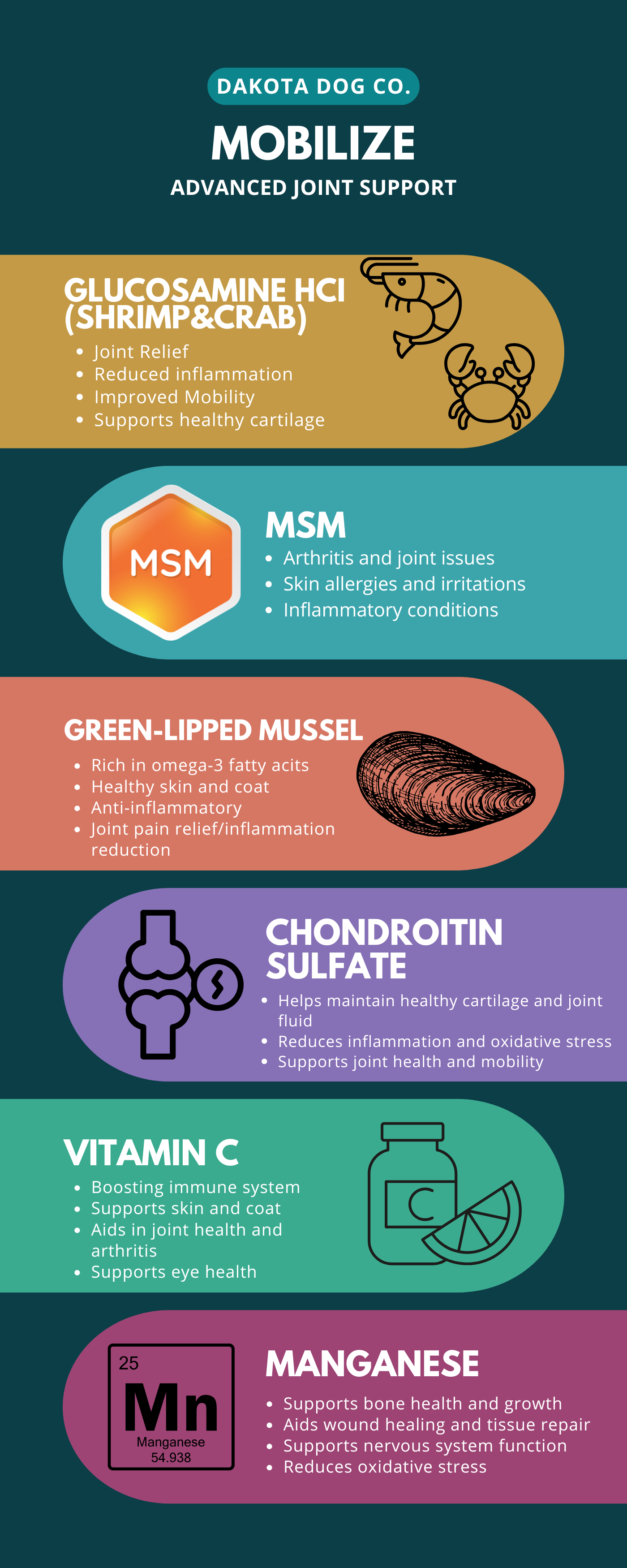 - Enhanced Joint Health: Mobilize helps alleviate stiffness and discomfort associated with aging and physical activity. Its powerful formula supports healthy cartilage and joint tissue, enabling your dog to move freely and comfortably.